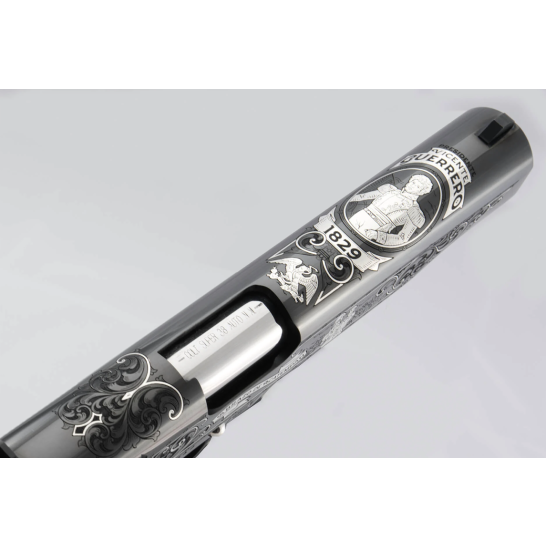 The left side of the firearm depicts details of Guerrero’s connection with the indigenous Aztecs, including a Jaguar fighter reflected in his Coat of Arms and within the borders of the motto La Patria Es Primero. Additional shading of the Aztecs flows on the frame and slide flats.