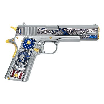 Its slide is masterfully engraved with an effigy of George Washington, the American flag, thirteen stars, and the heraldic eagle—each symbol carved in deep relief and accented with hand-applied red and blue inking that echoes the nation’s banner. This is not merely a firearm; it is a tribute in steel—an heirloom for patriots, a statement of purpose, and a crown to liberty itself.