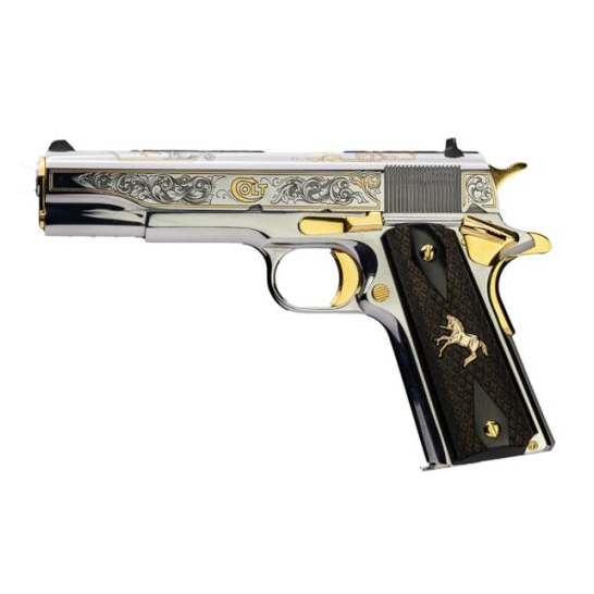 This Colt pistol utilizes the famed Series-70 design and is based on the O1911C Government Classic model. This Deluxe Limited Edition is extremely rare, and hard to find. It features elaborate scroll and vice acid etching on the top, left, and right side of the slide. Gold plating depicts the rampant pony logo.