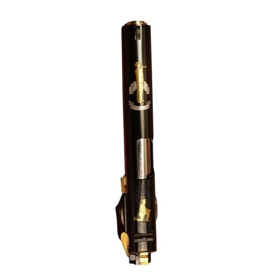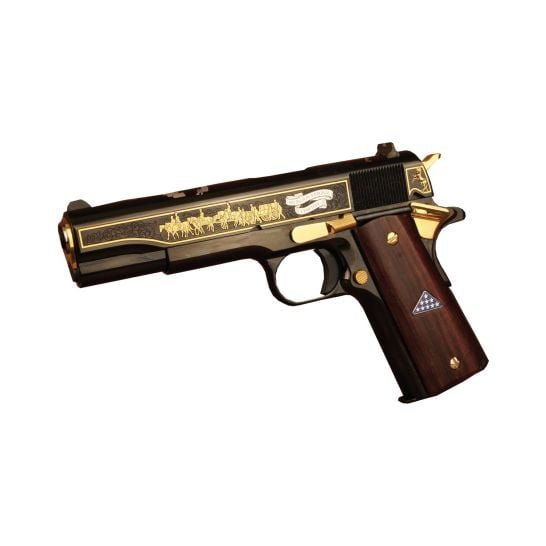 This pistol commemorates the dedication of the 3rd U.S. Infantry Regiment, “The Old Guard,” the U.S. Army’s ceremonial unit since 1948. It honors their vital role in guarding the Tomb of the Unknown Soldier and conducting funeral ceremonies at Arlington National Cemetery. The pistol’s design features elements representing the key aspects of these ceremonies: the 21-gun salute (right side), the Caisson and Casket Team (left side), the Bugler and Chaplain (top), and the folded flag medallion (grips), symbolizing the nation’s respect for fallen service members.