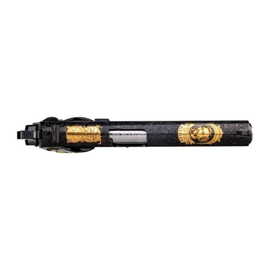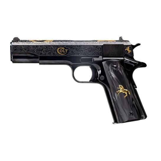 The Colt 1911 Government Limited Edition with only 500 made is chambered in .38 Super, a timeless classic redefined for the modern shooter. Crafted with precision, this iconic pistol features a 5″ barrel and a steel frame for durability and accuracy. Equipped with a blade front sight and fixed rear sight, every shot hits the mark with pinpoint precision. With a 9-round capacity, the Colt 1911 Government ensures you’re always prepared for any situation. Elevate your shooting experience with the elegant touch of black Pearlite grips and custom engraved gold inlays, making every moment on the range or in the field truly unforgettable. Experience the epitome of performance and style with the Colt 1911 Government. Order now and own a piece of firearm history.
