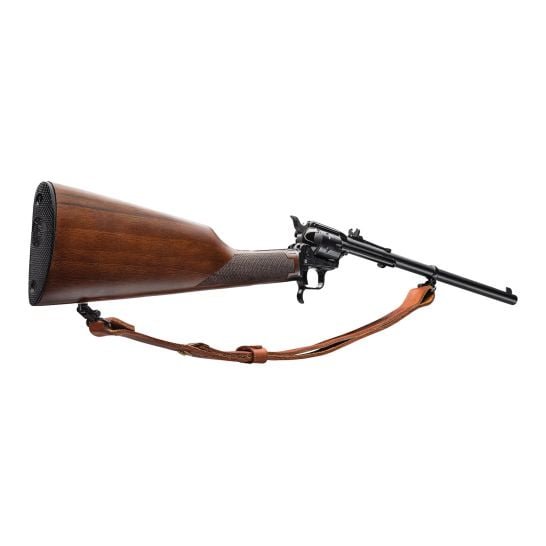 Introducing the rough Rider Rancher carbine chambered in 22 LR, featuring a 16 inches barrel, a 6 round capacity and a beautiful walnut stock. This latest addition to the heritage product line combines the versatility of a rifle with the classic appeal of a revolver, ensuring effortless handling and portability. Complete with an adjustable buckhorn sight and a leather sling, the Rancher enables you to effortlessly and precisely manage your ranch.
