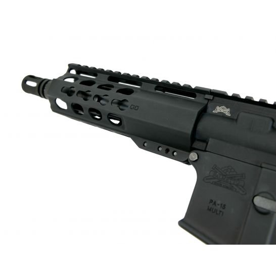 - Barrel: 4150V Chrome Moly Vanadium steel, nitride treated for durability and accuracy. Chambered in 5.56 NATO, with a 1/7 twist, M4 barrel extension, and a pistol-length gas system. Barrel is finished off with a 6″ PSA Lightweight keymod rail, low profile gas block, and A2 flash hider.