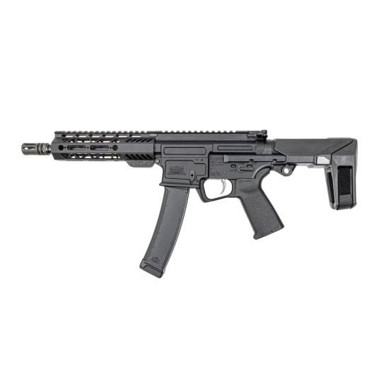 Lower: Forged 7075 T6 aluminum and then hard coat anodized, these lowers are purpose built to accept AR-V U9 and CZ Scorpion Magazines. The lower is assembled with a Palmetto State Armory MOE EPT PDW lower build kit with a Magpul Grip and SB Tactical HBPDW Pistol Stabilizing Brace.
