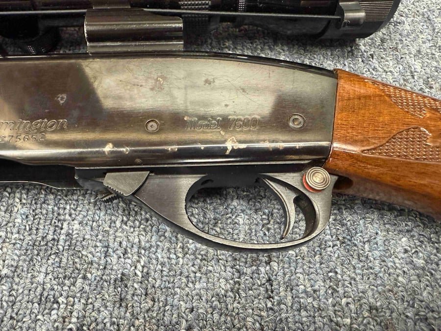This pump action rifle has a 22in barrel with a 3-9x scope. It has wooden furniture and a sling.