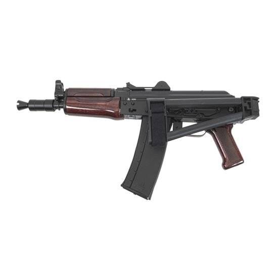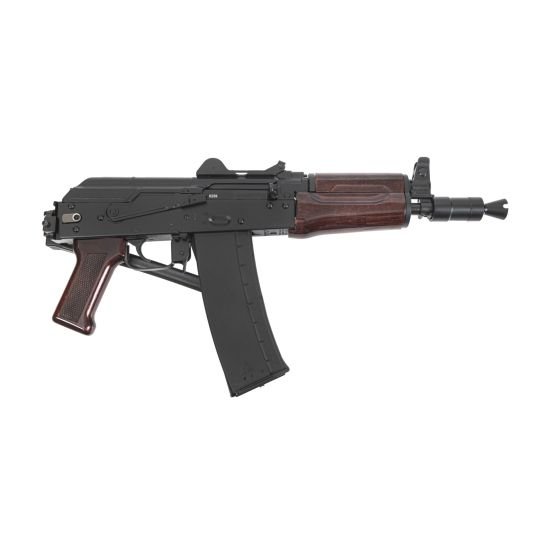 The Soviet Arms AKS-74U “Krinkov” pistol features a side folding rear trunnion, hinged dustcover, and short barrel for the most compact AK PSA has offered to date. This pistol is equipped with a black triangle side folding pistol brace, hinged dustcover with integrated rear sight, and plum gloss wood furniture. The original AKS-74U was adopted in 1979 to bridge the gap between a sub gun and a full-length rifle. This Soviet Arms AKS-74U is chambered in 5.56×45 and still maintains all the charm and aesthetic of the original 5.45x39mm Krinkov, but in an easier to obtain caliber.