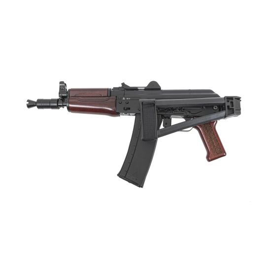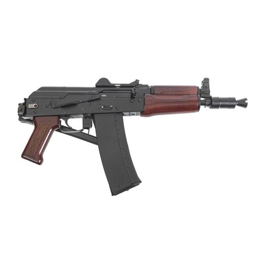 The Soviet Arms AKS-74U “Krinkov” pistol features a side folding rear trunnion, hinged dustcover, and short barrel for the most compact AK PSA has offered to date. This pistol is equipped with a black triangle side folding pistol brace, hinged dustcover with integrated rear sight, and red wood furniture. The original AKS-74U was adopted in 1979 to bridge the gap between a sub gun and a full-length rifle. This Soviet Arms AKS-74U is chambered in 5.56×45 and still maintains all the charm and aesthetic of the original 5.45x39mm Krinkov, but in an easier to obtain caliber.