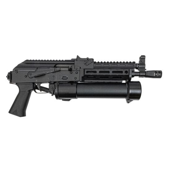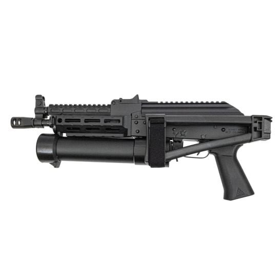 Introducting the Soviet Arms AK-V ” Stizon”. In collaboration with Stuff and Things Inc., this AK-V has been transformed into a pistol reminiscent of the Russian PP-19 Bizon.This AK-V “Stizon” features a helical 55 round magazine, as well as a Midwest Industries MLOK Handguard compatible with Stizon magazines. This pistol also retains core AK-V features with a blowback-operated system and a hammer forged front trunnion and bolt/carrier.