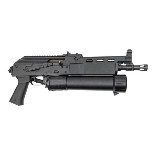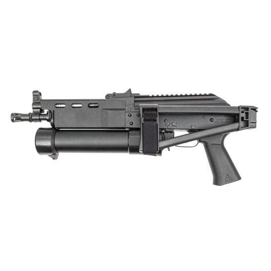 Introducting the Soviet Arms AK-V ” Stizon”. In collaboration with Stuff and Things Inc., this AK-V has been transformed into a pistol reminiscent of the Russian PP-19 Bizon. The AK-V “Stizon” features a helical 55 round magazine, as well as a Bizon-style handguard and flash hider. This pistol also retains the core AK-V features with a blowback-operated system and a hammer forged front trunnion and bolt/carrier.